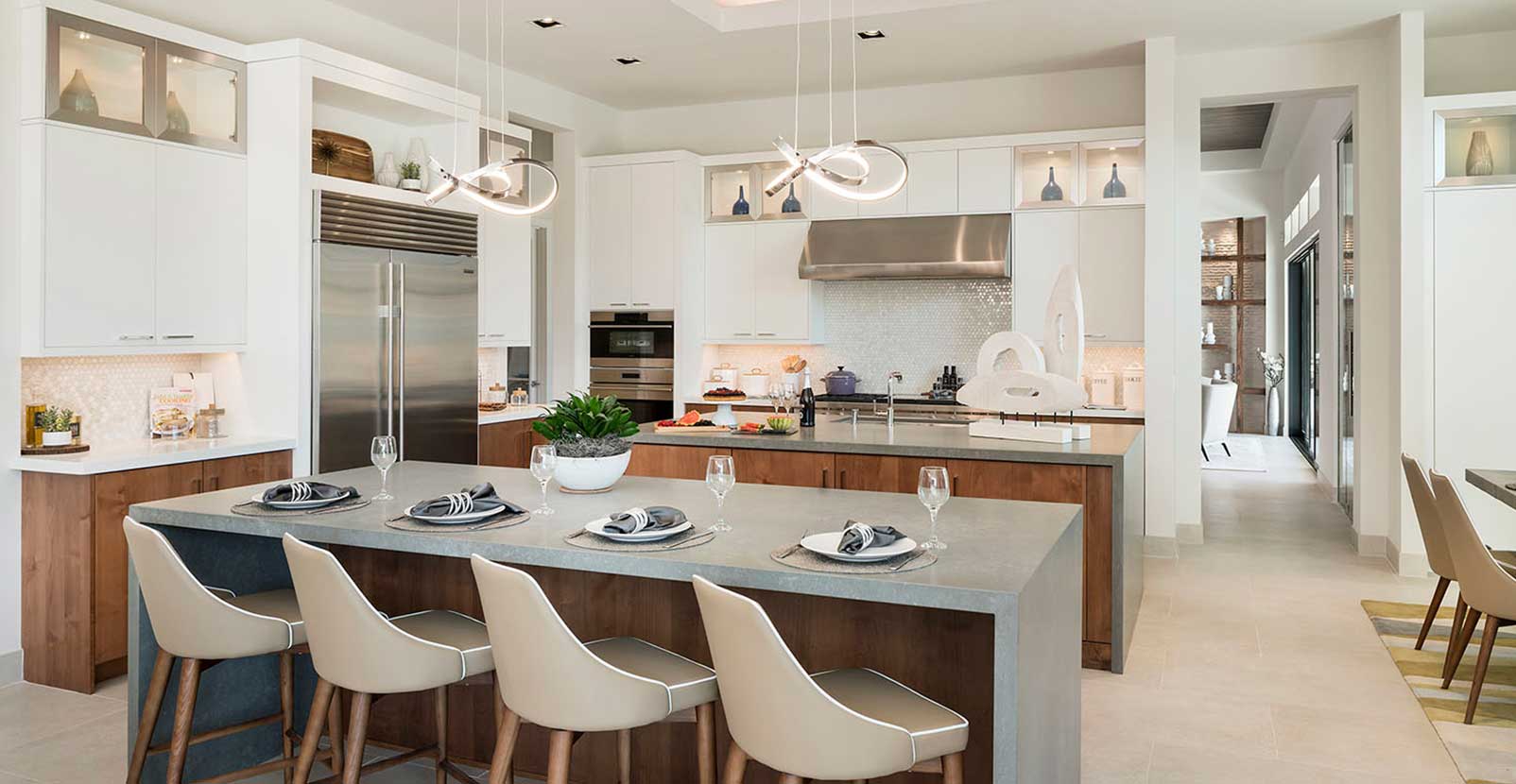 Whitewing is an infill neighborhood located in an established gated luxury community. These new production homes are designed to blend with existing custom homes. Our contemporary ranch design for the Cholla floor plan includes a private guest casita with living room, kitchenette, bedroom and bath. The left wing of the home is dedicated to the primary suite with dual walk-in closets and a large primary bathroom. Throughout the home, high ceilings with room-specific accents, like wood plank in the primary suite, add character to this unique design. The plan is perfect for entertaining, featuring two oversized kitchen islands, multiple outdoor entertainment areas, in-ground swimming pool and a large wine cellar.