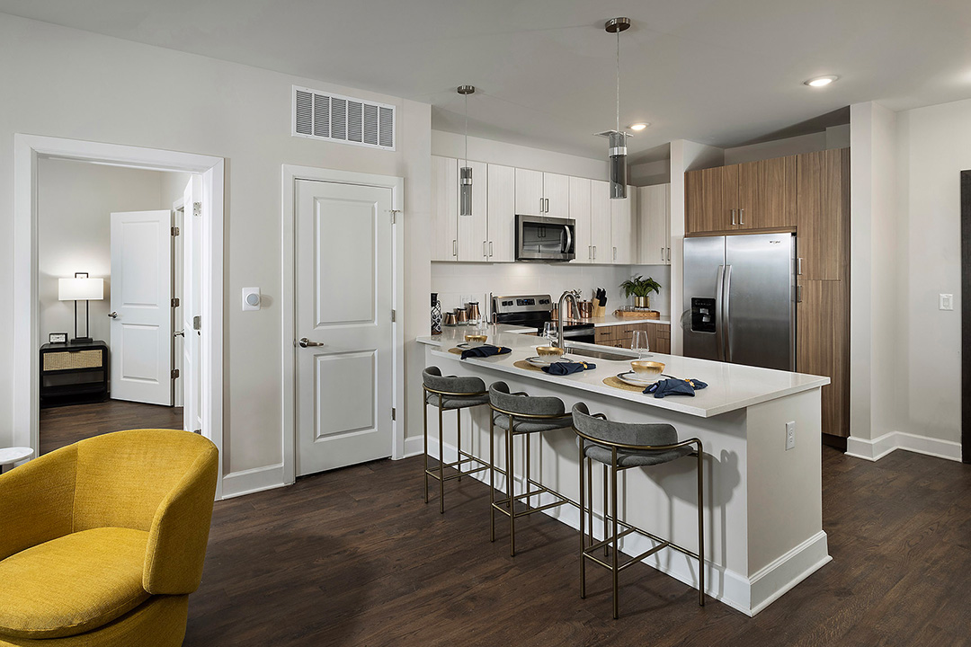 The Haven at Gulch is a captivating fusion of modern luxury and Nashville’s rich cultural heritage. Upon stepping inside, residents are greeted by open-concept layouts that create an inviting and spacious atmosphere. High ceilings and large windows flood the living spaces with an abundance of natural light, enhancing the overall sense of warmth and comfort. Our Interior Design team carefully curated each detail, incorporating soft and soothing colors that complement the building’s “Americana” theme. Subtle hints of red, white, and blue are tastefully integrated throughout. The use of walnut elements, warm caramel undertones, and gold accents infuse the interiors with mid-century modern elegance, creating an atmosphere of refined sophistication. From the well-appointed kitchens to the meticulously crafted living areas and bedrooms, every corner of The Haven at Gulch exudes a sense of charm and allure, ensuring that residents experience the true essence of Nashville’s soul within the comfort of their homes.