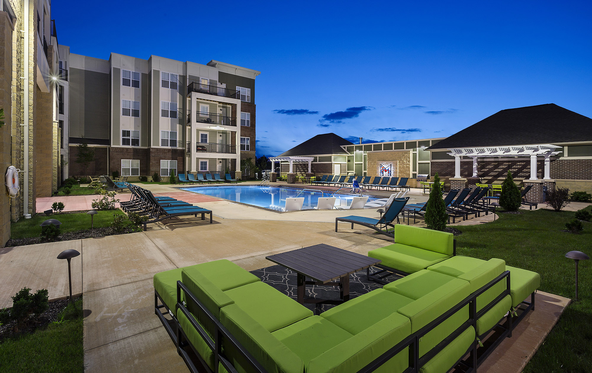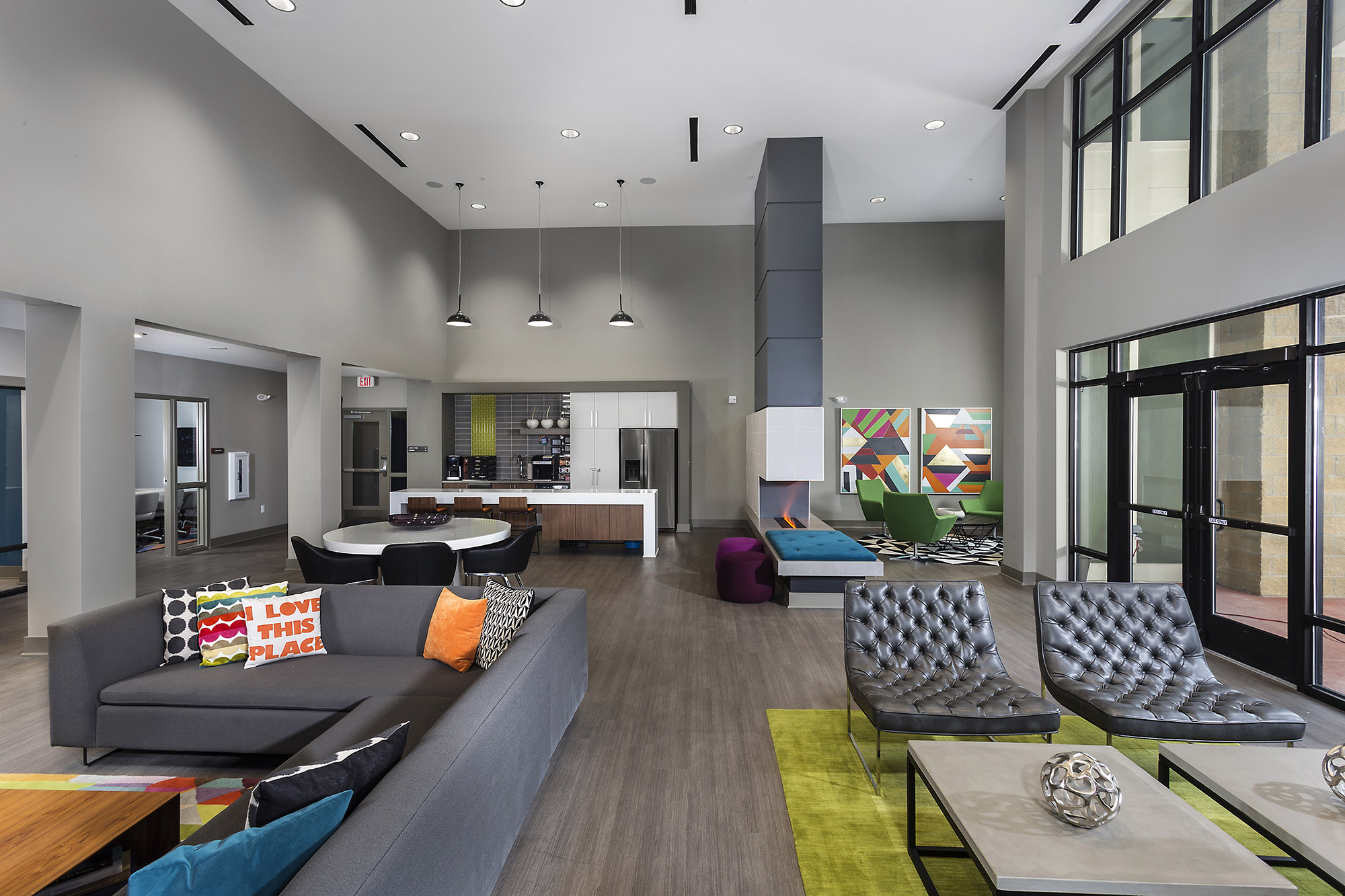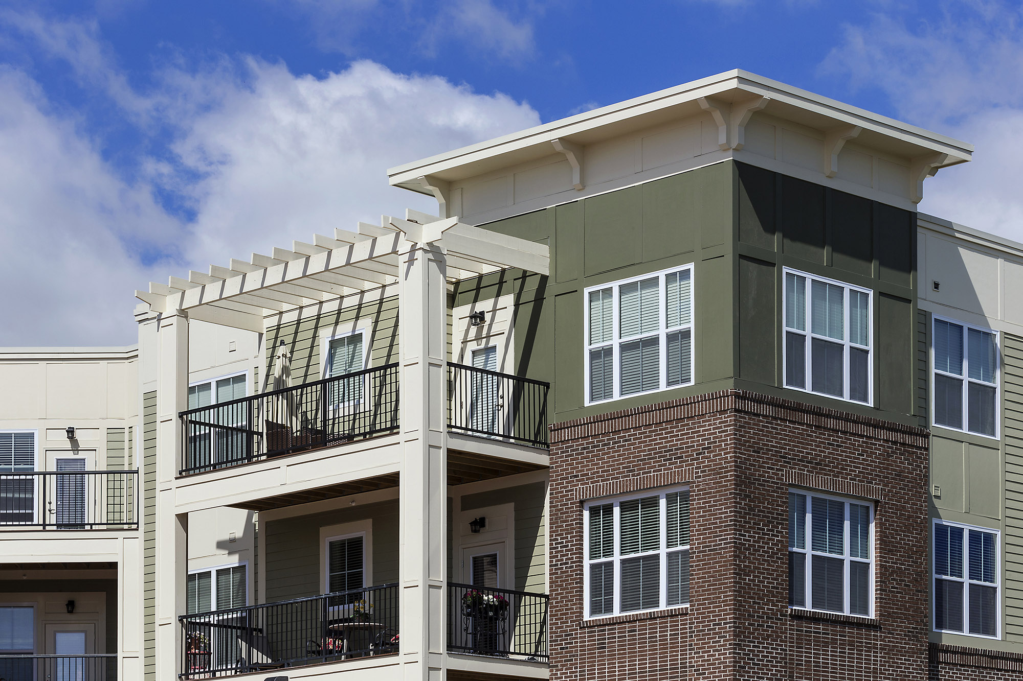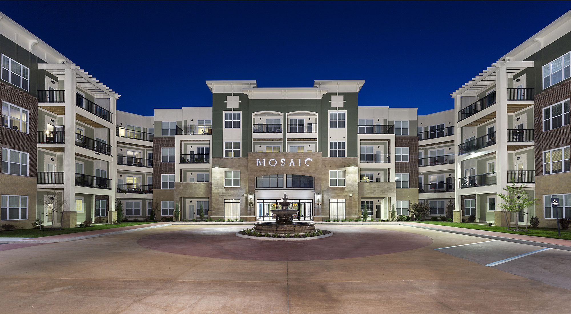 Mosaic at Levis Commons is a large-scale project that maintains a smaller, residential feel thanks to a creative site plan and building footprint. The design incorporates unique detailing through corbels, strong vertical columns and oversized balconies with overhead trellises. Exterior colors and material shifts emphasize key design elements, like prominent corner parapets, and add interest and depth. The integrated clubhouse has a fitness center, a variety of entertainment areas and a resort-style saltwater pool with sundeck and grilling stations.