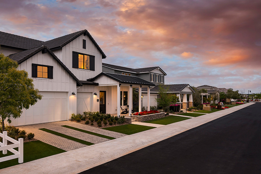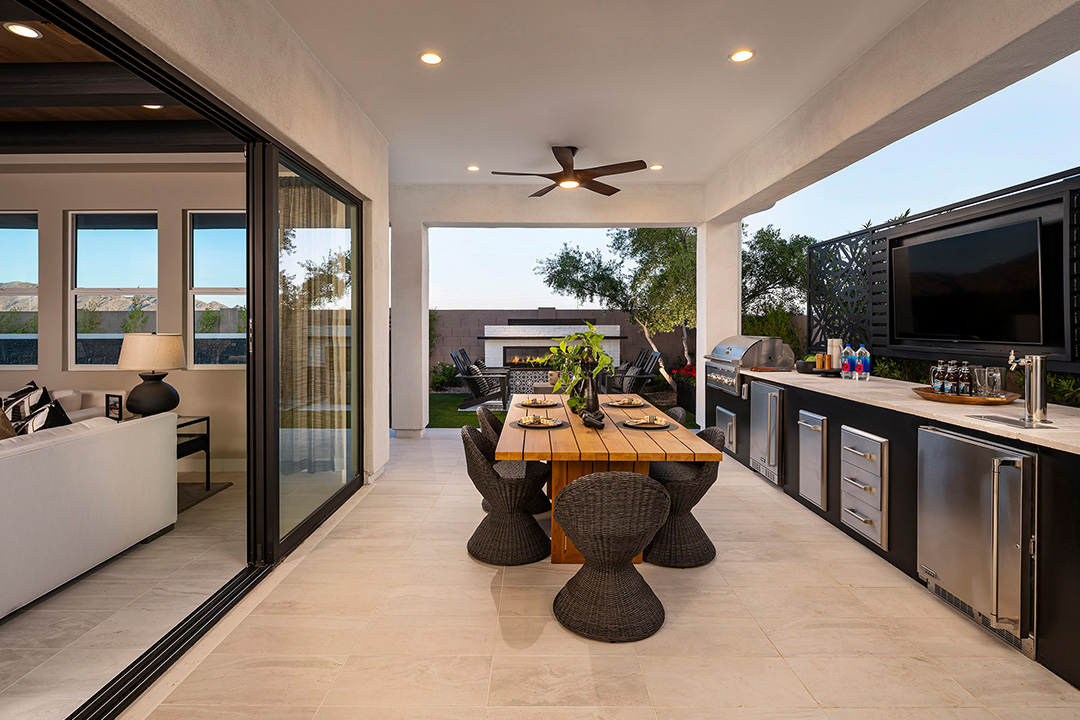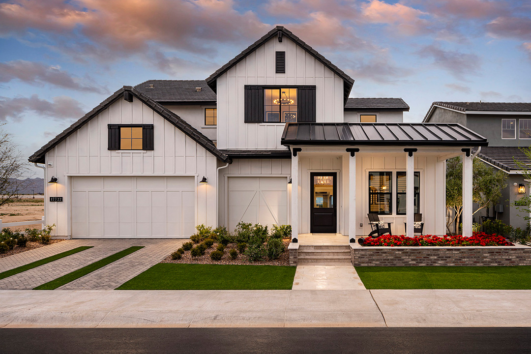 The Ballantyne design showcases a contemporary farmhouse aesthetic, characterized by vertical white paneling, black door and window fixtures and awnings with metal roofing. Indoors, the incorporation of elements such as wooden ceiling treatments, beams, and differing heights serves to delineate the interconnected living areas. The great room glass doors fully open to extend the living space to the outdoors. The primary bedroom is located on the main floor and conveniently connects to the laundry.