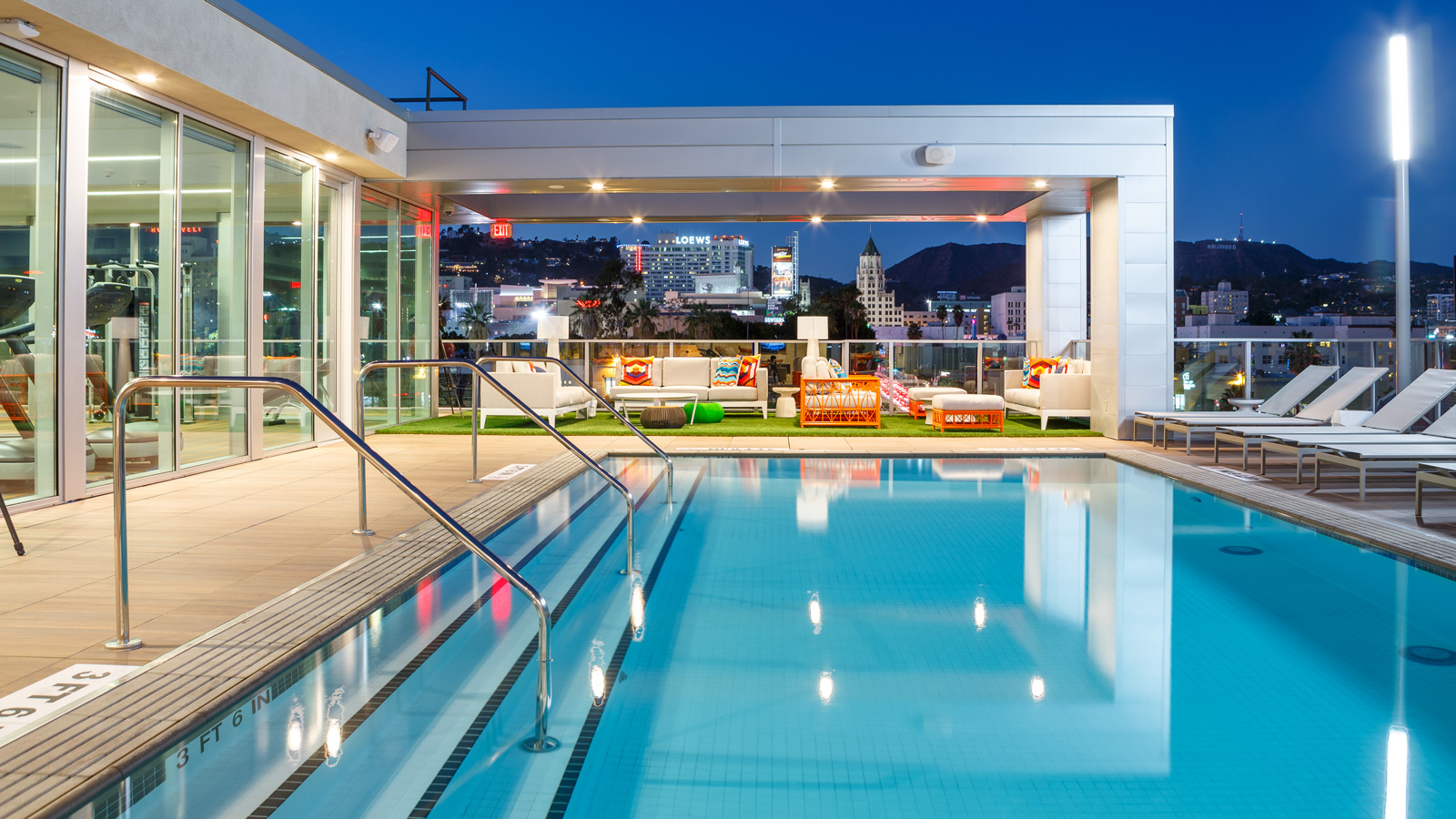 The modern architecture is an outspoken design statement with a highly-articulated façade that references the Mid-Century classic homes in the nearby hills and stands out from the eclectic context of a resurgent Hollywood. There are lush courtyards and an expansive rooftop lounge. The deck, with dramatic views of the Hollywood Hills, Hollywood sign and downtown Los Angeles, is the only one of its kind in the area.