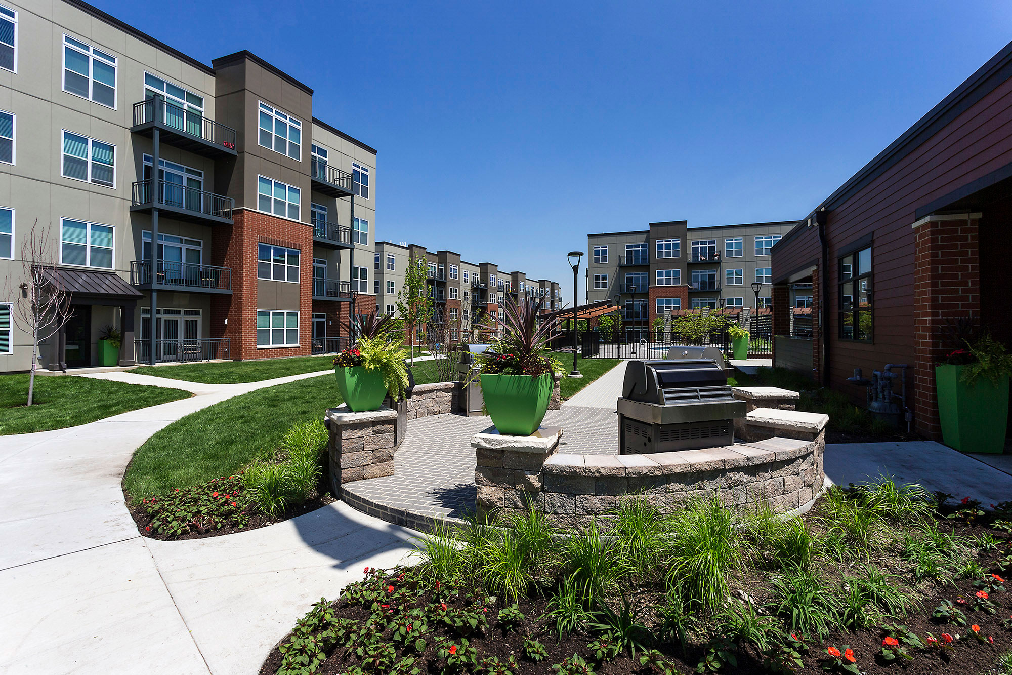 This unique community was the product of the creative repurposing of a former office building site that sat vacant for many years. The goal was to create an urban product in a suburban setting, starting with sleek, simple building exteriors with metal balconies. At the heart of the site, the clubhouse continues that modern styling and offers a business center, fitness center with an indoor spa area, dog wash station, top-grade communal kitchen and living space that leads outdoors to the pool and fire pits.